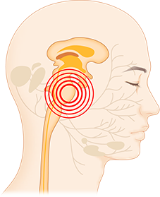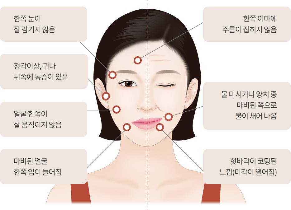 ![]() 마비된 쪽 이마에 주름이 잡히지 않으며, 눈이 감기지 않고 얼굴에만 마비 증상이 나타납니다. 또한, 귀와 귀 뒤쪽에 통증이 느껴질 수 있습니다. |
