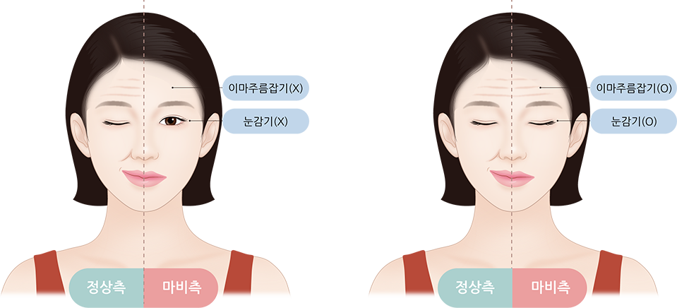 증상 | ![]() 양쪽 이마에 균일하게 주름이 잡히며, 눈이 감기고 말이 어눌하며 한 쪽 손발의 마비 또는 힘이 빠지는 등의 증상이 함께 나타납니다. |
