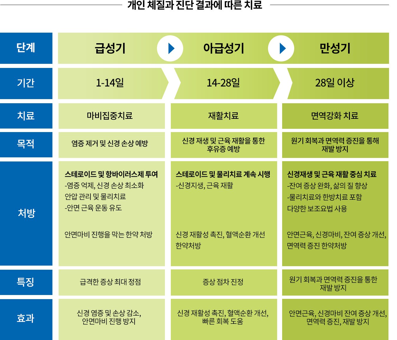급성 단계에서는 스테로이드 약물요법, 전기치료, 마사지 치료 등을 병행하여 치료 효과를 극대화시킬 수 있습니다.